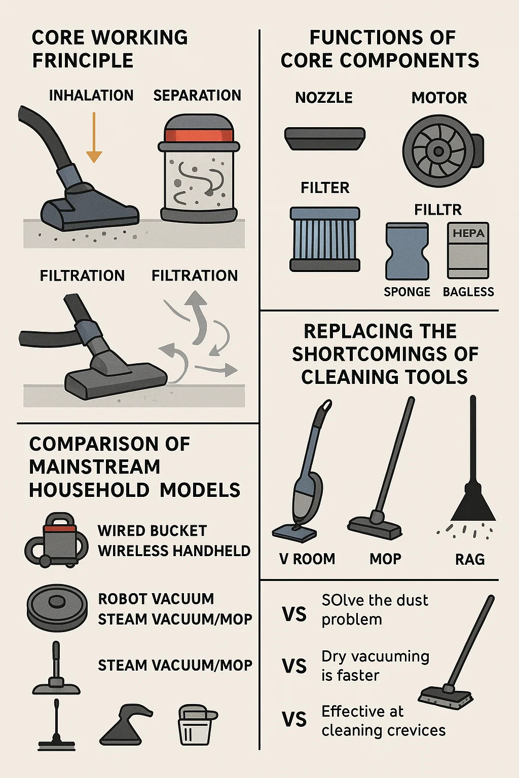 Schlüsselvorgänge: ▶ Inhalation - Der Motor dreht sich und erzeugt einen Niederdruckbereich. Luft, Staub tragen, in die Saugdüse stürzt; ▶ Trennung - Die Staubluftmischung wirbelt im Staubbehälter, wodurch schwere Partikel in die Staubsammlung fallen. ▶ Filtration - Feinstaub wird vom Filter gefangen, und saubere Luft wird von hinten entladen.